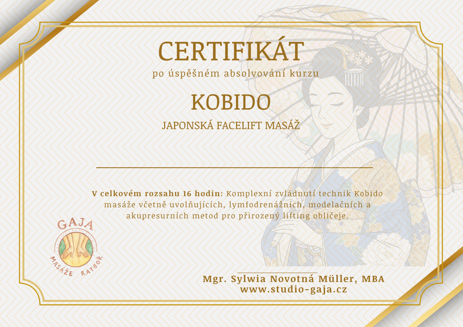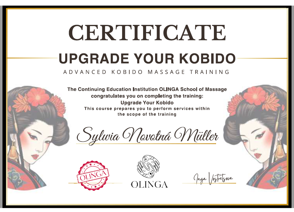 Pro zájemkyně pořádám individuální i skupinová školení techniky KOBIDO zakončená certifikátem. Kurz je určen pro odborníky – pouze pro kosmetičky nebo profesionální masérky. Cena je stanovena dohodou podle typu a rozsahu školení.